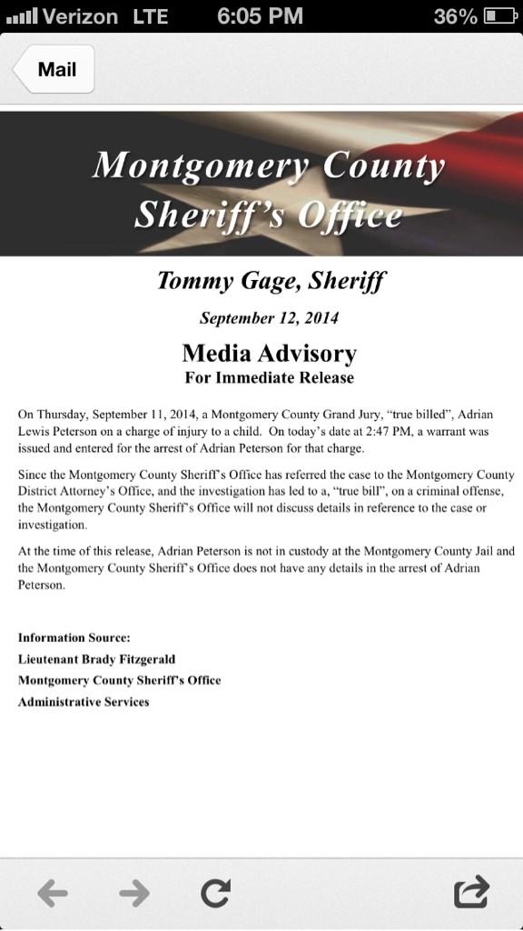Sports Radio 610 in Houston obtained a draft of the police report which says Peterson admitted that he did, in his words, “whoop” one of his children last May while the boy was visiting him in Houston.